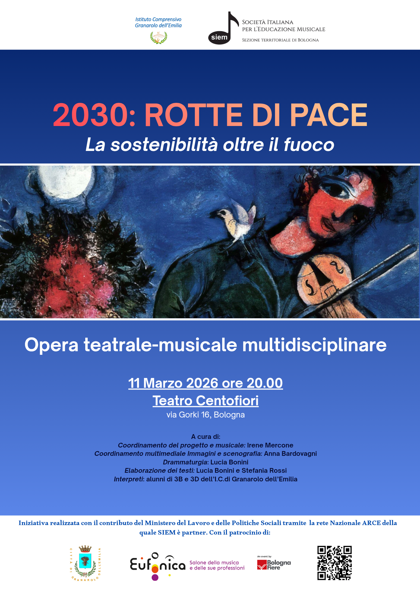 Tra i partner di Eufonica 2026, SIEM – Società Italiana per l’Educazione Musicale, sezione di Bologna insieme all’Istituto Comprensivo di Granarolo dell'Emilia promuove lo spettacolo multidisciplinare “2030: Rotte di Pace. La sostenibilità oltre il fuoco”, in programma l’11 marzo 2026 alle ore 20.00 presso il Teatro Centofiori di Bologna.